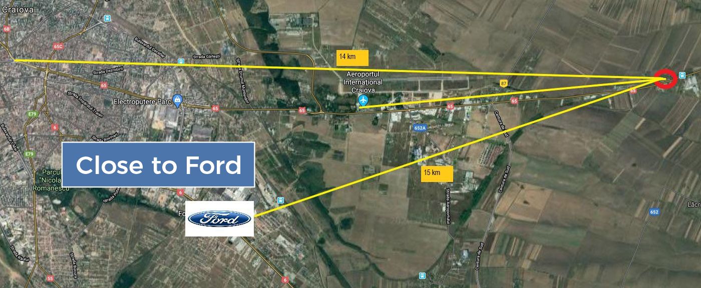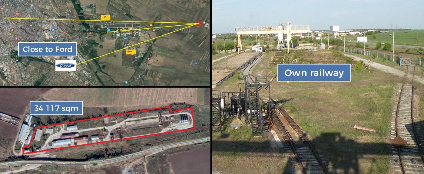 Thus, our company owns and can operate and / or rent the logistics warehouse with a generous area of 34,117 sq m, located on E 574 CRAIOVA-PITEȘTI, at a distance of 10 km from Craiova city center, 3 km to Craiova Airport and 15 km to the Ford Romania SA car factory.